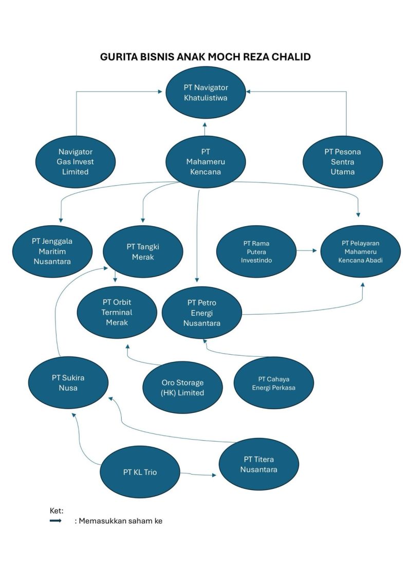 “PT Sukora Nusa tercatat sebagai pemegang 33 persen saham PT Tangki Merak. Sisa saham PT Tangki Merak dikuasai PT Mahameru Kencana Abadi. Anak Moch Riza Chalid, Muhammad Kerry Adrianto Riza merupakan Komisaris Utama PT Tangki Merak, dan Gading Ramadhan Joedo merupakan Direktur Utama PT Tangki Merak yang juga merupakan anak angkat Moch Riza Chalid,” beber Hengki.