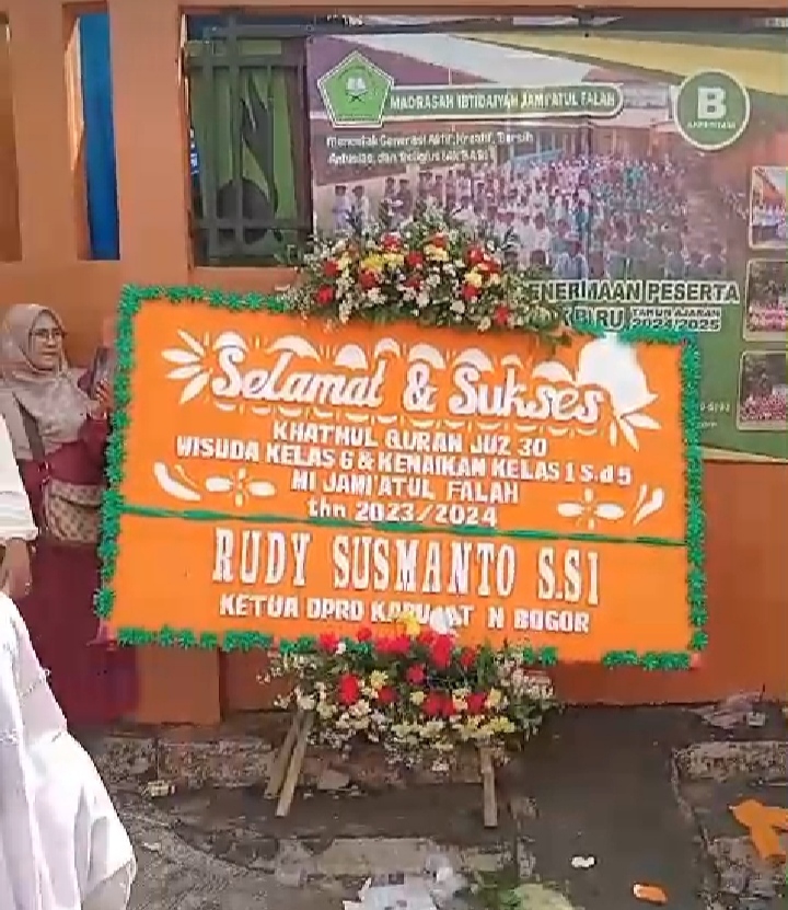 Ketua DPRD kab Bogor Rudy Susmanto S.Si memberikan karangan bunga ucapan selamat kepada sekolah MI Jami’atul Falah Yang di sambut baik Oleh kepala sekolah Mi Jami’atul Falah bu Nurhayati