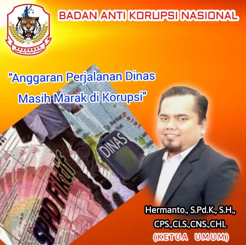 Mata Pena News – Ketua Umum Lembaga Swadaya Masyarakat Badan Anti Korupsi Nasional (LSM BAKORNAS), Hermanto, S.Pd.K., S.H., CPS., CLS., CNS., CHL., menyatakan bahwa praktik korupsi dalam penggunaan anggaran perjalanan dinas, termasuk perjalanan dinas fiktif, masih sangat marak terjadi di Indonesia.