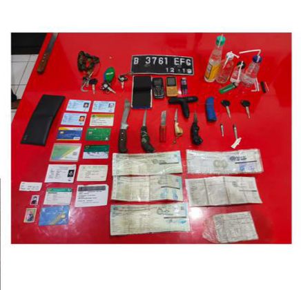 1 handphone Redmi warna biru, 2 handphone Samsung warna hitam dan kuning 6 STNK sepeda motor lalu 5 kunci kontak sepeda motor dan 1 plat nomor B-3761-EFG lalu 6 buah pisau.